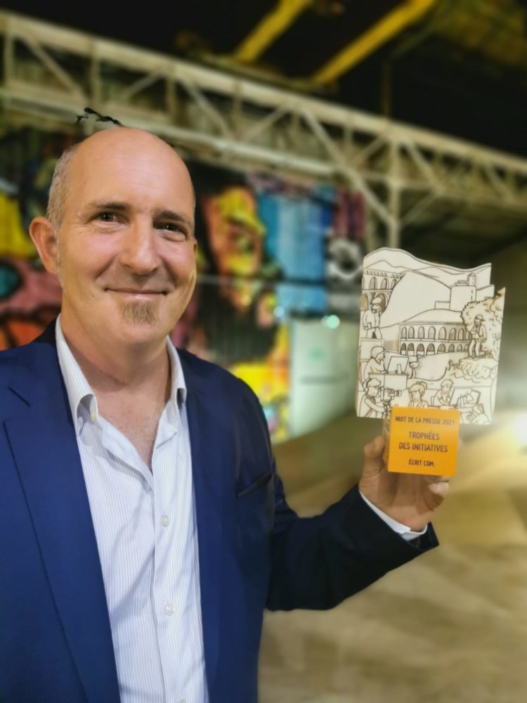Le prix a été remis à Abdel Samari, directeur de la publication et fondateur d’Objectif Gard, par Jean-Luc Gibelin, vice-président de la Région Occitanie
